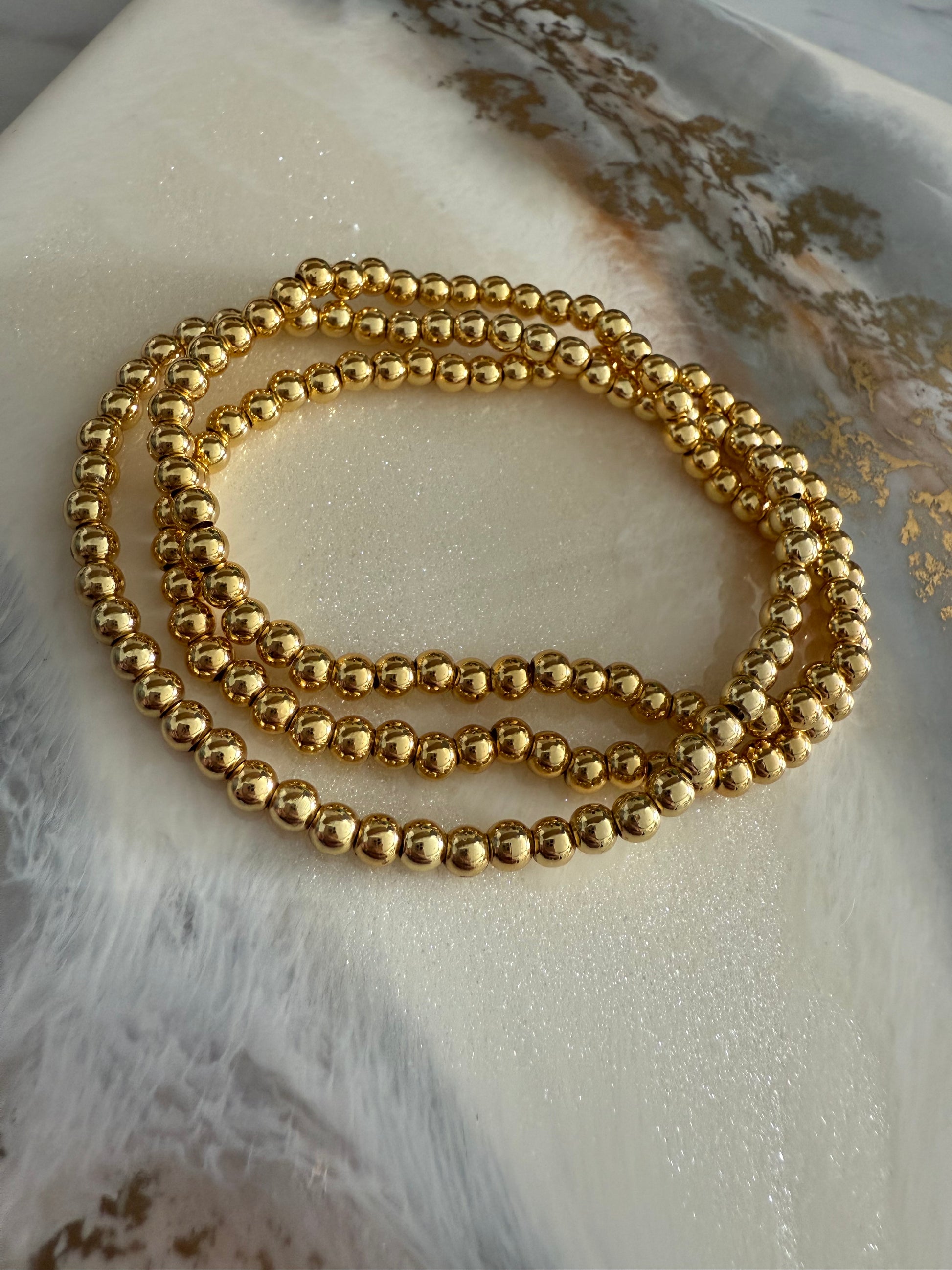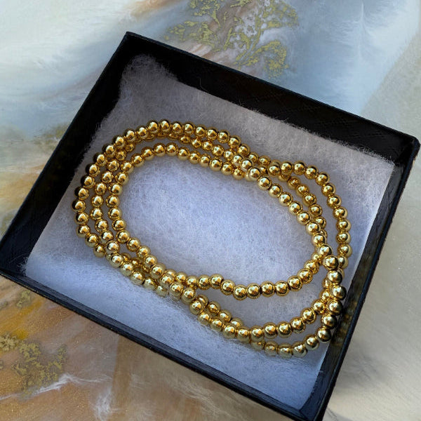Effortless elegance meets everyday wear. The Goldie trio features three 18k gold plated stretch bracelets that catch light with every movement.
